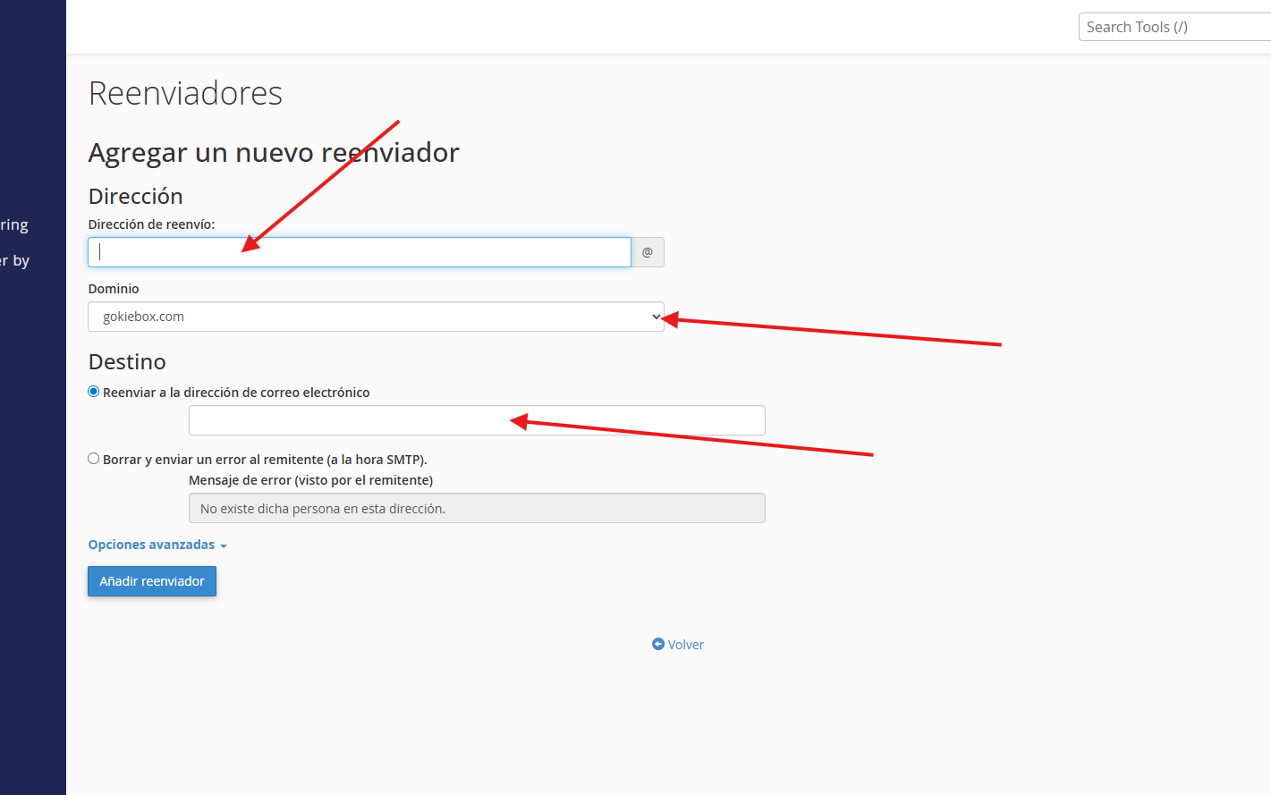 - Dirección de reenvío: Escribe únicamente la primera parte del correo que deseas redirigir (el nombre de usuario antes del @).